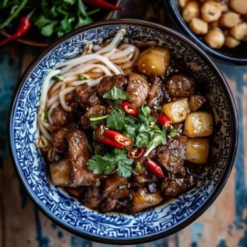 - 將準(zhǔn)備好的牛肉放入砂鍋中,加入生姜片、青花椒、八角、冰糖、食鹽3克、生抽30克、料酒30克以及熱水(水量需淹沒牛肉)。燉煮1小時,使肉質(zhì)熟透并入味。